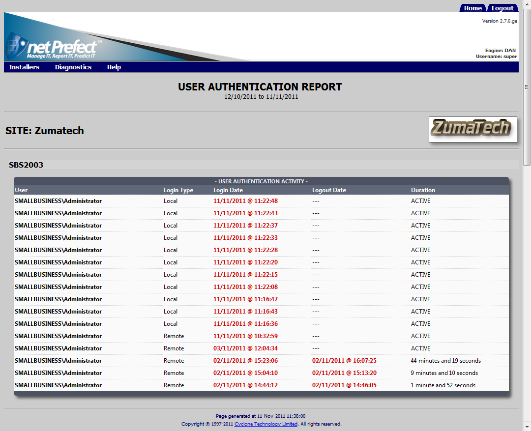 Report on user login activity, detailing who logged in, when they logged in and then out and the type of login that was performed.